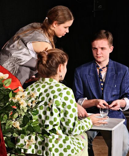 Dazu haben wir uns an das eher der Filmtechnik entstammende dramaturgische Mittel des ineinander Schneidens der drei Szenen herangewagt, um - sozusagen parallel – die sich zuspitzende Entwicklung in den einzelnen Konstellationen vor Augen zu führen. Dies ermöglicht – neben aller Wort- und Situationskomik – auch die Verdichtung von Ayckbourns Konzeption, alle seine Figuren an einen Punkt zu führen, an dem sie eigentlich etwas Entscheidendes in ihrem Leben ändern könnten. Die Betonung liegt aber eben auf dem Konjunktiv! Zur Gruppe: Sieben SpielerInnen aus dem letzten Jahr fehlen uns heuer, dafür sind fünf neue Spielerinnen (kleines i!) „nachgewachsen“ und haben sich bereits sehr gut als Verstärkung etabliert. Wie in nahezu allen Oberstufen-Schultheatergruppen, ist auch bei uns das darstellende Spiel zunehmend eine weibliche Domäne geworden, was natürlich die Auswahl und Umsetzung von Stücken stark steuert und unsere beiden „mutigen“ Jungs in eine besondere Position versetzt. Vielleicht steckt aber Mut ja doch auch an????