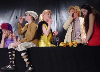 So kam die eher zufällige Begegnung mit dem Jedermann-Stoff sehr gelegen, zumal er in mehrfacher Hinsicht interessante Möglichkeiten eröffnete. Der Grundgedanke, dass über der materiellen Ausrichtung des Lebens mitmenschliche Verhaltensweisen ebenso in Vergessenheit geraten wie das Bewusstsein der Vergänglichkeit irdischer Werte, war den Spielern nicht nur zugänglich, vielmehr schien ihnen seine Darstellung mehr als zeitgemäß. Auch wurde es als schlüssig empfunden, dass in der vorliegenden Fassung keiner - nicht einmal die Hofmannsthalschen (guten) "Werke" - Jedermann auf seinem letzten Gang begleiten wollte. Auf die allegorischen Figuren "Mammon" und "Glaube" sollte zugunsten der Lebensnähe ebenso verzichtet werden wie auf die kunstvolle Verssprache. Die starke Textlastigkeit auf Seiten der Hauptfigur kam uns insofern gelegen, als wir - den Titel deutend - den Jedermann auf zehn SpielerInnen verteilten. Sie setzen zu Beginn des Spiels paarweise variierende Akzente von Jedermann frei, ehe sie - im Angesicht des Todes - zu undifferenziert hilflosen und verängstigten Kreaturen nivelliert werden. Nicht unerwähnt darf bleiben, was ebenfalls einzigartig ist an unserer Inszenierung: die eigens komponierte Musik - zum ersten Mal von Steffen Murau, der so ganz nebenbei auch noch 1/10 Jedermann darstellt! ![]() |