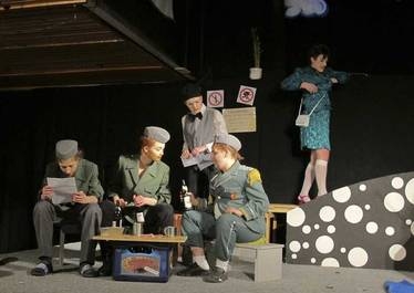 Vom korrekten Grenzschützer Konstantin kann der verarmte Havlicek jedenfalls keine Hilfe erwarten. Konstantin (überzeugend: Cassandra Perl) bewacht pflichtbewusst mit polierten Stiefeln das Ufer auf der rechten Seite der Brücke. Doch seinen Kollegen auf der anderen Seite die missliche Lage des Drogisten erklären? Kommt nicht in Frage. „Ich? Dort hinüber? In Uniform? Na das gäb’ ja einen sauberen Grenzzwischenfall mit unabsehbaren Nachfolgen. Ich darf ja nicht einmal auf die Brücke. Dabei ist die doch neutral. Das ist grotesk.“ Um Havlicek herum haben die Schüler der neunten bis zwölften Klasse das ganze Ausmaß des skurrilen Grenzalltags mit viel Witz inszeniert: Die Bürger beider Staaten haben sich längst mit dem Zustand arrangiert und pflegen untereinander regen - nicht selten intimen - Kontakt. Kommentiert wird das Geschehen von einem eigens ins Stück geschriebenen „Szenenengel“ (René Kardós), der die Zuschauer durch die turbulenten Verhältnisse lotst. Während am linken Ufer der Grenzer Thomas Szamek (herrlich rüpelhaft verkörpert von Nina Schultz) mit seinen Kameraden Mrschitzka (Marlis Balzert) und Vavrinek (Alena Oberste-Schemmann) Karten spielt und Bierflaschen leert, besucht Szameks Tochter Eva (schelmisch am BH zupfend gespielt von Ben Westerath) ganz selbstverständlich ihren geliebten Konstantin auf der anderen Flussseite. Auf der Brücke angelt ein mürrischer Privatpädagoge (Sarah Christl), der gewaltig mit seiner Frau aneinander gerät (Philipp Link), und sich mehr um Fische und Würmer sorgt, als um die Grenze. Auch das schräge Schmuggler-Duo in Nonnen-Verkleidung, Schmugglitschinski (Lisa Zerna) und Frau Leda (Jan Daumin), hat kein Problem, die Grenzer auszutricksen. Richtig grotesk wird es freilich, als Havlicek an die Regierungschefs X (Maxi Heß mit „Sekretär“ Antonia Lutz) und Y (Jessica Laschinger) gerät, die sich nachts heimlich auf der Brücke treffen wollen. In einem flüchtigen Moment begehrt der Drogist da gegen die bürokratischen Mühlen auf - was später entscheidend für das obligatorische Happy End sein wird. Die Schüler hätten in diesem Jahr das Stück selbst ausgesucht, erklärt Regisseurin Petra Vetter, die seit 20 Jahren Stücke am Leibniz-Gymnasium inszeniert, gemeinsam mit Walter Flintsch, der seit 30 Jahren den „Theatervirus“ nicht mehr los geworden sei und auch im Ruhestand noch als technischer Leiter helfe. Die Stückwahl überrascht. „Hin und her“ gehört nicht zu Horváths bekannten Werken. „Für unsere Belange hat es gut gepasst, auch wenn es nicht das beste Stück von Horváth ist. Wir haben viel verändert und es auf unsere Bedürfnisse zurechtgeschnitten“, so Vetter. Die Songs im Stück habe man zum Beispiel gestrichen, dafür die Figur des Vavrinek und des Engels eingefügt. Im Oktober letzten Jahres begannen die Proben, ab Januar die heiße Phase, am Schluss habe man jeden Tag geprobt. Kein Pappenstil bei 15 Schülern auf der Bühne, und nochmals 17 Schülern, die hinter den Kulissen für Licht, Ton, Bühnenbild, Maske, Kostüme und Requisite zuständig sind. Für die musikalische Untermalung waren Maximilian Leonhardt und Wolle Völkl verantwortlich. Die Theatergruppe habe allerdings schon einmal mehr Mitglieder gehabt, berichtet Vetter. „Wir sind froh, dass es jetzt wieder so viele sind. Allerdings gehen heuer auch einige“, erklärte sie mit Blick auf die Abiturklasse.